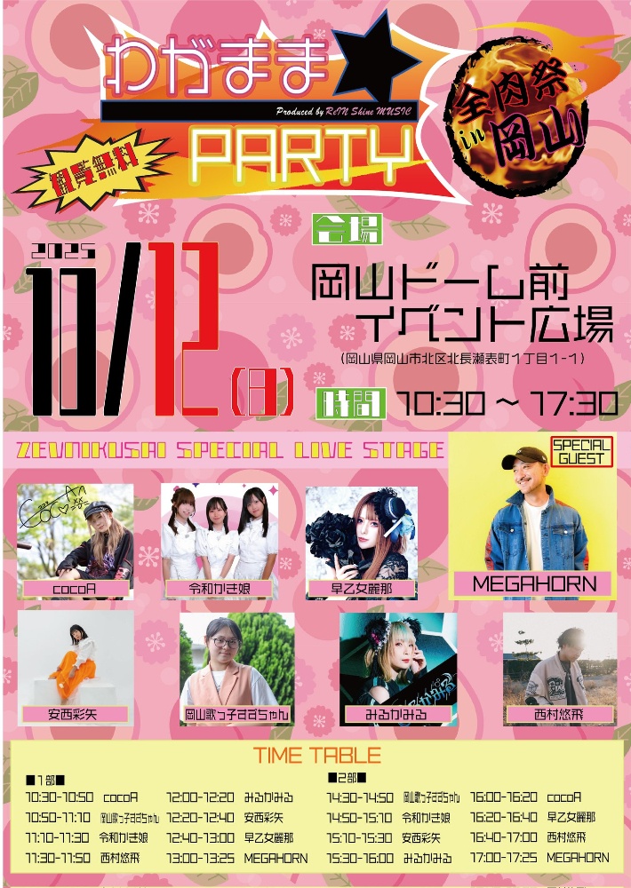 2025年10月12日(日)全肉祭 岡山岡山ドーム前イベント広場観覧無料1部、2部ともに出演します出演時間は↓をご確認ください新メンバー「萩田葵咲(はぎたきさ)」の初参加になります萩田初チェキ&最古参狙いにぜひお越しください